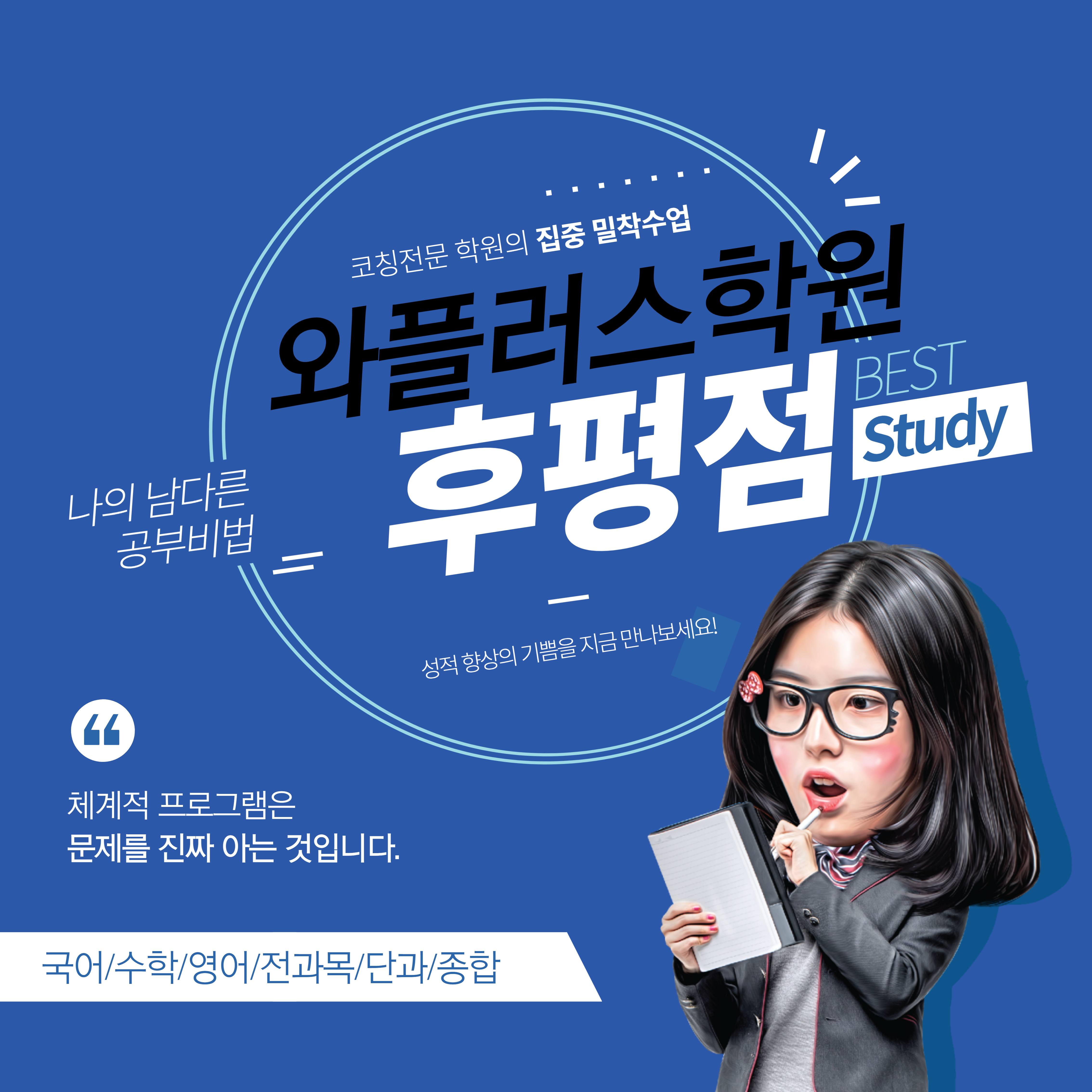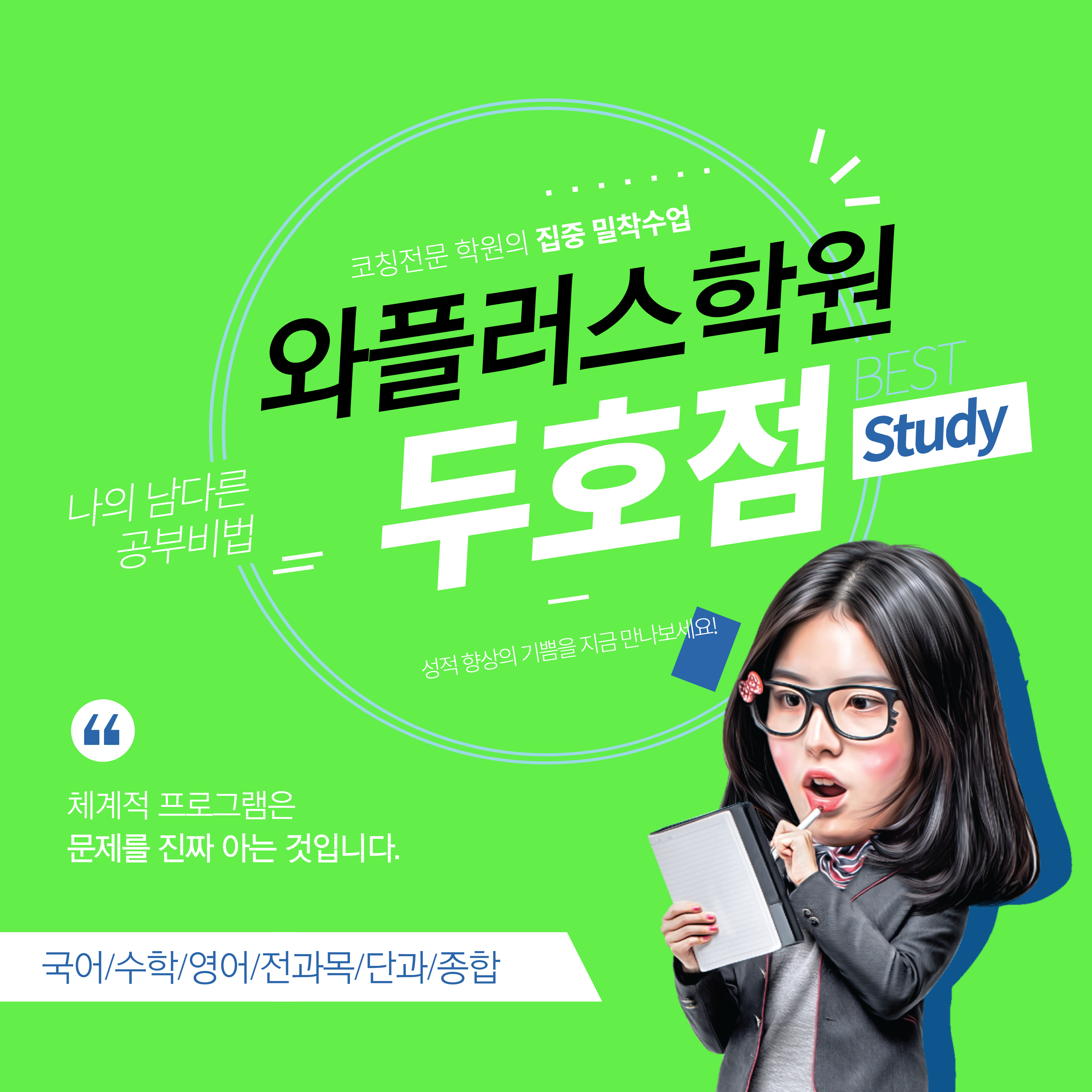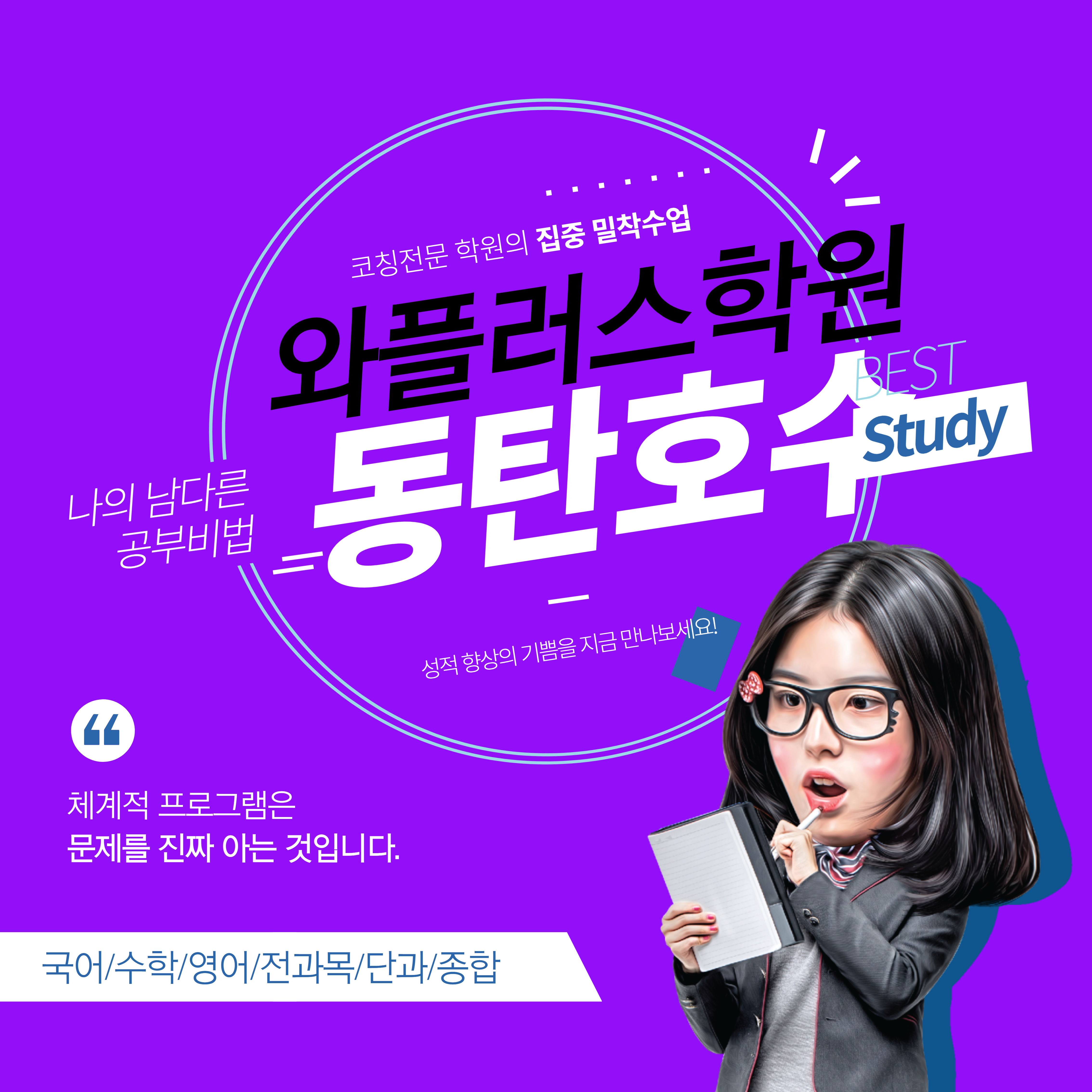 주소 : 화성시 반송동 동탄원천로 163 503호 반송점 와와학습코칭학원 석우초, 석우중, 예당초, 예당중, 예원초에서 5분거리!! 우리은행, 맘스터치 건물 5층! WA+학습코칭센터 학원 소개 일반 학원과 다른 1대1 개인별 수준에 맞춤 수업 국어&영어&수학, 전과목 학습코칭학원 입니다! 상담이 밀려있어서 100% 예약후 방문 상담이 가능합니다. WA+ 학습코칭학원 소개 및 장점 1. 풍부한 경험과 교육자료를 기반으로 내신/ 입시 완벽 대비합니다. 2. 지역 학교 내신동향은 물론 검증된 교수법과 자체 문제 은행을 보유하고 있습니다. 3. 한수업에 3~8명만 수강인원을 받습니다.(예약제) 4. 개인별 학습 커리큘럼, 개인별 맞춤 교재로 수업합니다. 5. 개별적으로 학습 플래너 관리를 진행합니다. 6. ..